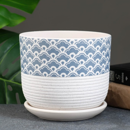 Горшок для цветов «Хоккайдо», керамический, с поддоном, 1.7 л, белый с голубым орнаментом