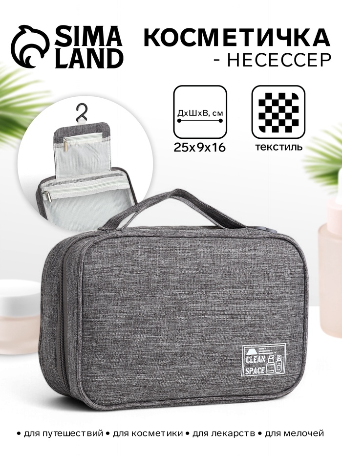 Косметичка-несессер дорожная на молнии, с крючком, с ручкой, серая