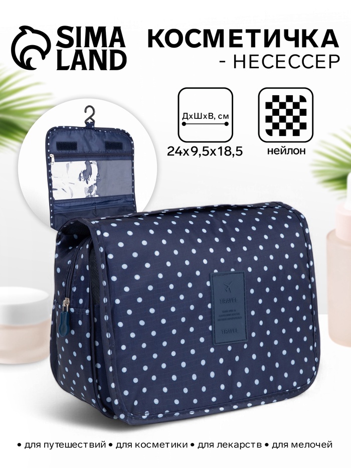 Косметичка-несессер дорожная на молнии, липучках, с крючком, с ручкой, в горошек, тёмно-синяя