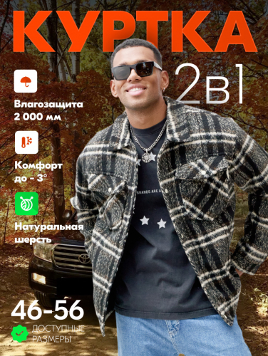 Куртка рубашка шерстяная в клетку мужская демисезонная черного цвета 58596Ch