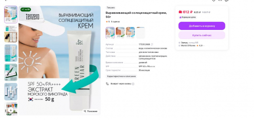 Выравнивающий солнцезащитный крем с экстрактом морского винограда SPF 50+/PA++++, 50г, TENZERO