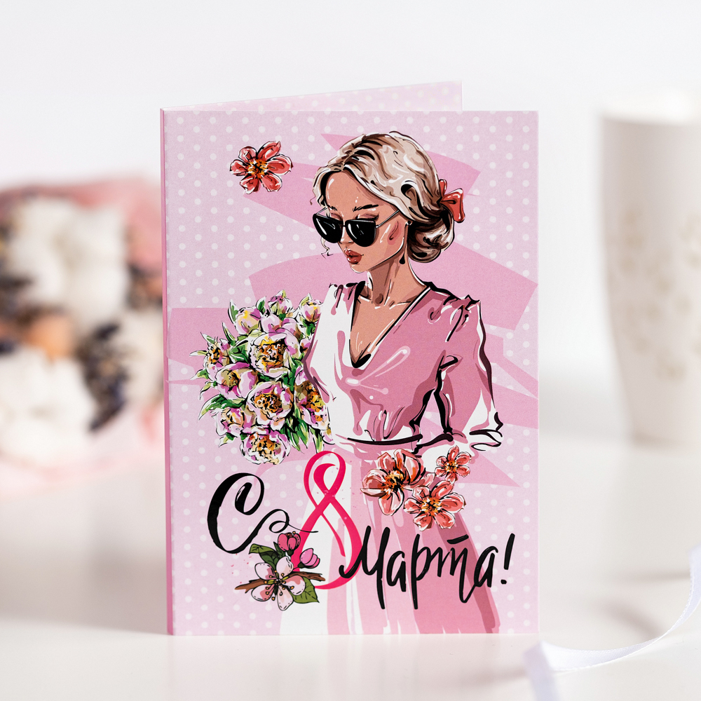Открытка 4 шоколадки "С 8 марта (девушка на розовом фоне)"
