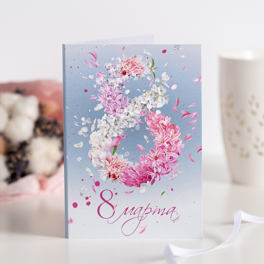 * Открытка 4 шоколадки "8 марта (белые и розовые цветы на светло-голубом)"