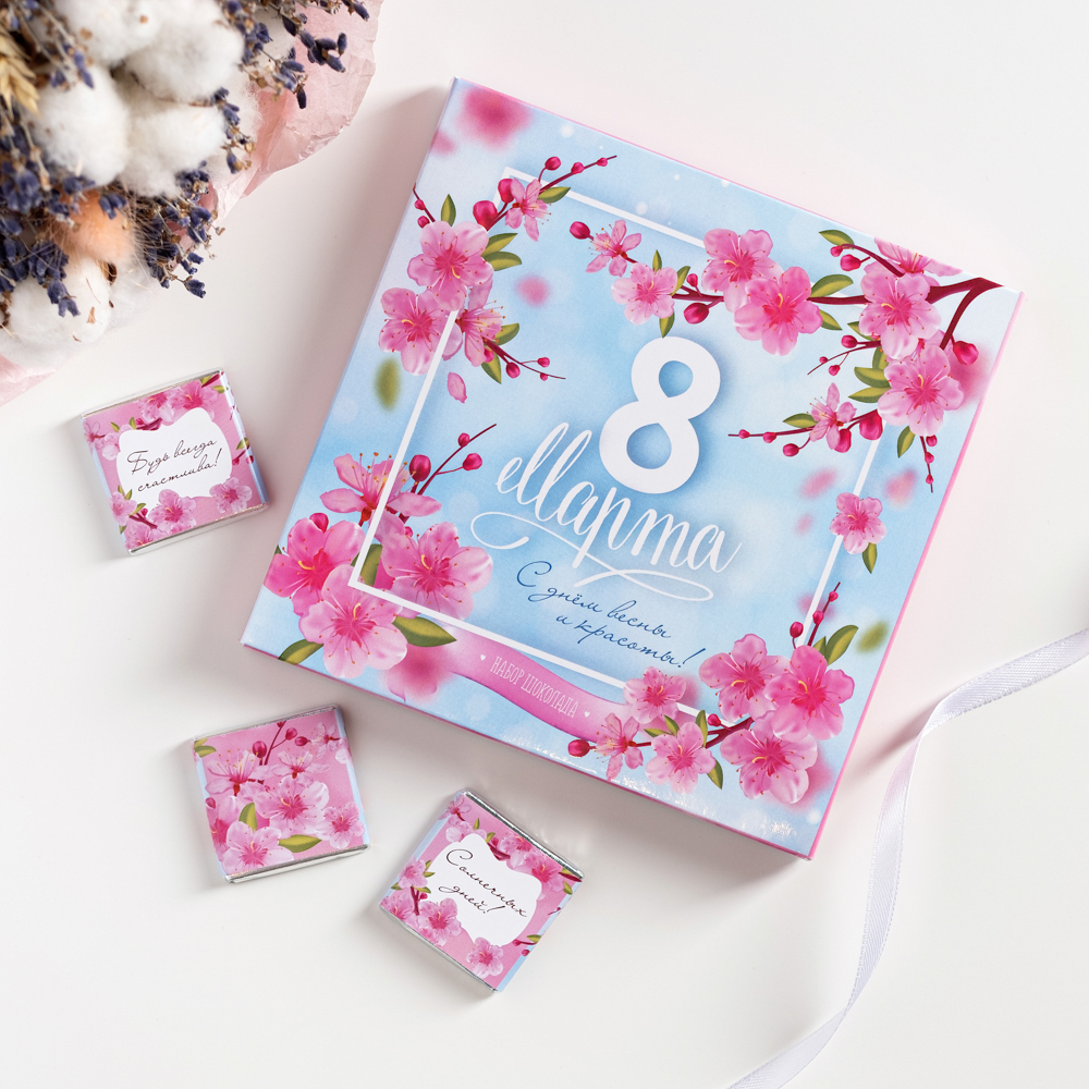 Набор 9 шоколадок "8 марта, с днём весны и красоты (розовые цветы на голубом)"
